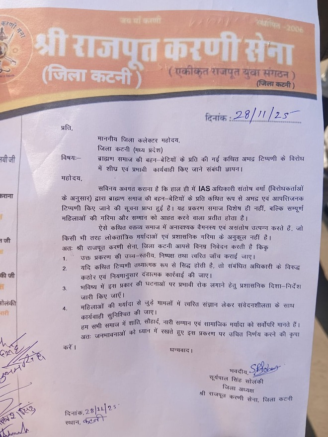 भोपाल में आयोजित अजाक्स सम्मेलन में 23 नवंबर को IAS ऑफिसर संतोष वर्मा द्वारा ब्राह्मण बेटियों पर आपत्तिजनक टिप्पणी किए जाने का विरोध करणी सेना के द्वारा भी किया जा रहा है । शुक्रवार को करणी सेना के पदाधिकारी पुरानी कचहरी चौराहे में बड़ी संख्या में एकत्रित हुये, जहां उनके द्वारा ias वर्मा के आपत्तिजनक बयान का विरोध किया गया । करणी सेना के पदाधिकारियो का कहना था कि ब्राह्मणों का अपमान क्षत्रियों का अपमान है और इस अपमान के विरोध में यह प्रदर्शन किया गया है । साथ ही ज्ञापन सौंप कर सख्त कार्यवाही करने की मांग भी की गई है । मांग पूरी नहीं होने पर उग्र आंदोलन किया जाएगा ।